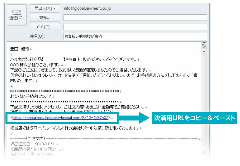 お見積りPDFなどを添付したメールに、弊社クレジットカード決済のURLを貼り決済していただく方法です。