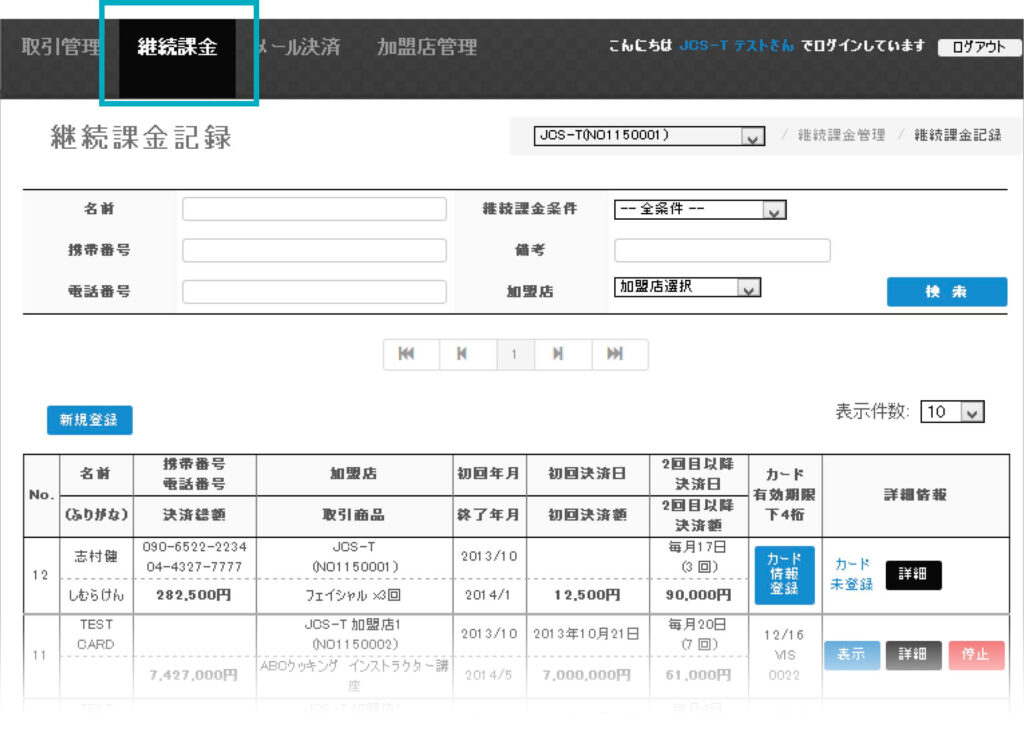 毎月継続して同じ金額をクレジットカードで課金できるシステムです。お客さまの個人情報とカード情報を一度ご入力いただくだけで、指定日に自動で同じ金額の決済処理が行います。